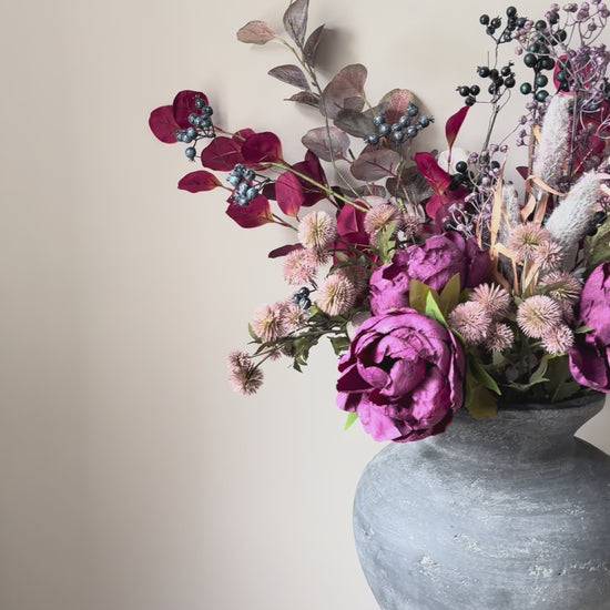 Bring a touch of rustic autumn charm into your home with this handcrafted faux flower arrangement. Styled with rich aubergine peonies, soft dahlias, clusters of berries and rustic poms, this arrangement is designed to make an elegant statement all year round.