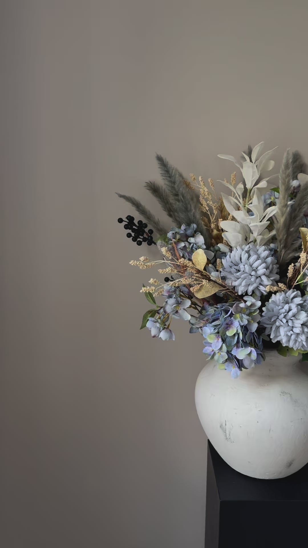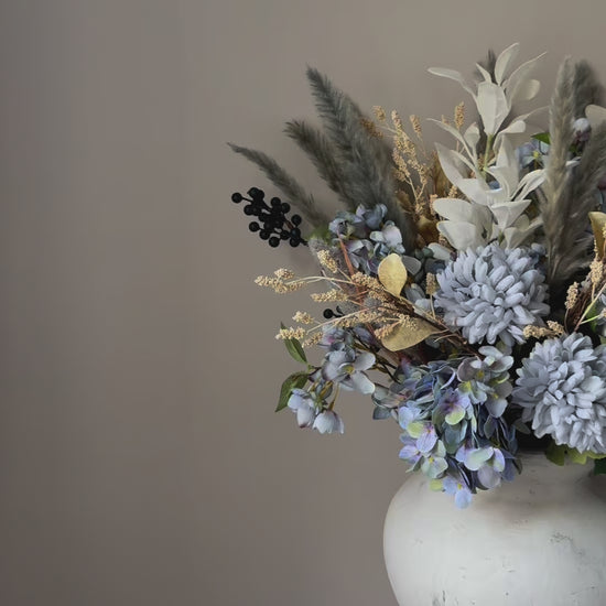 Elevate your home décor with this elegant rustic dried floral arrangement, featuring muted grey/blue hydrangeas, soft pampas grass, delicate cream stalks, and preserved foliage, this piece brings timeless charm and earthy sophistication to any space. Perfect for entryways, side tables, or mantelpieces, this ready-to-display arrangement offers lasting beauty without maintenance.