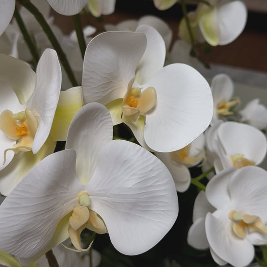 This stunning artificial arrangement features a beautiful array of white orchids, perfect for enhancing any space with elegance and sophistication. Crafted with high-quality faux flowers, this white orchid arrangement brings the beauty of nature indoors without the need for maintenance. Ideal for home decor, it adds a touch of timeless charm to any room, whether displayed in a living room, entryway, or office. Its realistic design and luxurious look make it a must-have for anyone looking to elevate their space with the beauty of white orchids, all year round.