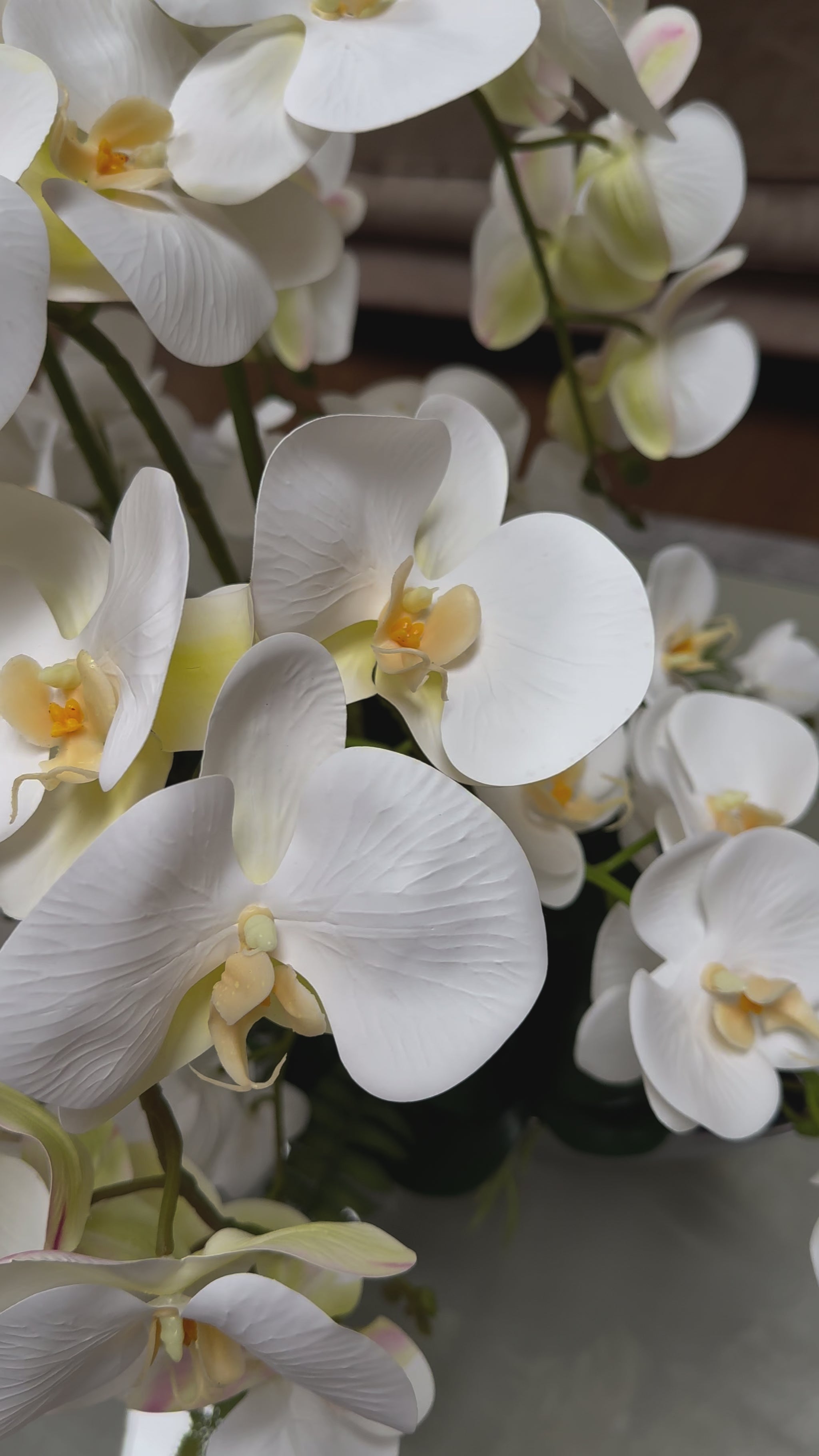 This versatile arrangement is a full 360 degree display and can be shown from any angle. It is made from 15 phalaenopsis stems (5 small, 5 medium & 5 large).